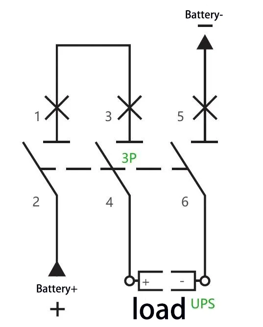 C:Наприклад: для ДБЖ потужністю 40 кВА та номінальною батареєю з 40 елементів (напруга вирівнюючого заряду: 14 В × 40 = 560 В) максимальний робочий струм розраховується як 40 кВА × 1,0 ÷ 90% ÷ 10 В ÷ 40 = 111 А. Можна використовувати автоматичний вимикач 3P 750 В 150 А, з двома його полюсами, з’єднаними послідовно. Спосіб підключення наступний: